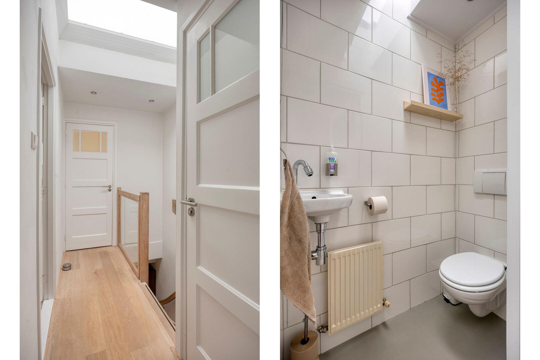 Op de overloop bevindt zich een separaat toilet. De badkamer is uitgerust met een grote inloopdouche en een wastafelmeubel.